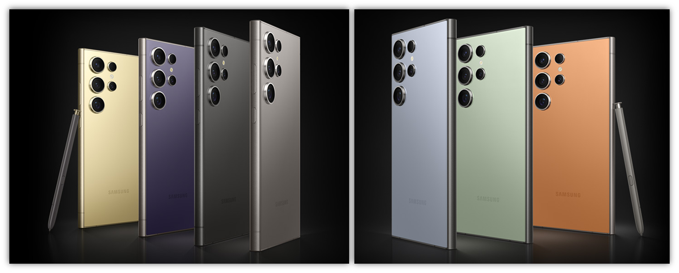 갤럭시 S24 울트라 역시 7가지 컬러로 일반컬러(티타늄 옐로우 티타늄 바이올렛 티타늄 블랙 티타늄 그레이) 4가지와 삼성닷컴, 삼성 강남점 전용 컬러(티타늄 블루 티타늄 그린 티타늄 오렌지)3가지가 있습니다. 특징으로는 프레임 소재가 티타늄이 쓰여서 이름에 티타늄이 들어가 있습니다. 갤럭시 S24 일반 모델에 비해 조금 더 톤이 어두운 점이 특징이고 바이올렛 컬러의 경우 측면은 회색이어서 유니크한 외관을 가지고 있습니다.