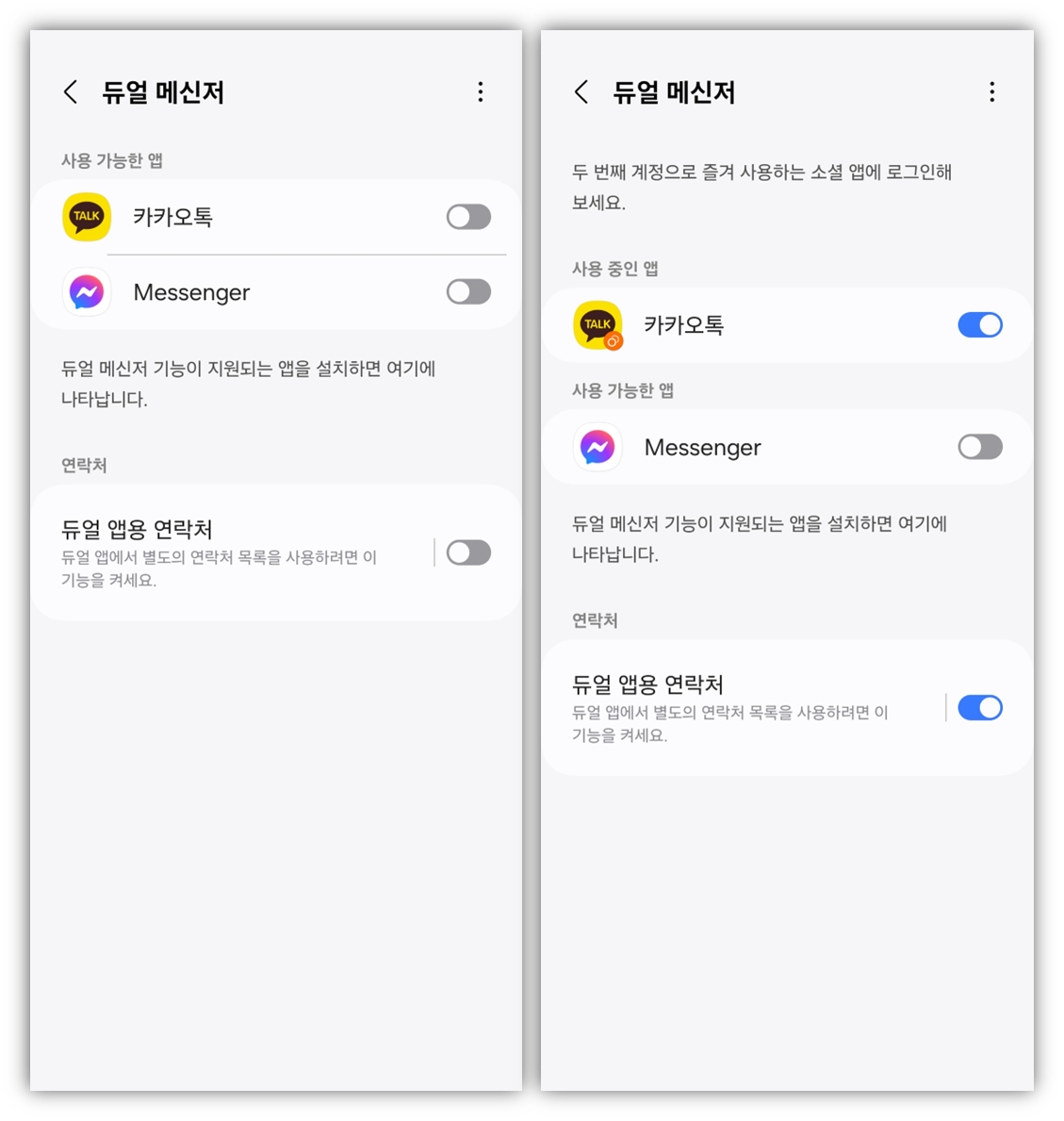 듀얼메신저에서 별도의 연락처 목록을 사용하려면 듀얼앱용 연락처를 활성화 시켜 주세요