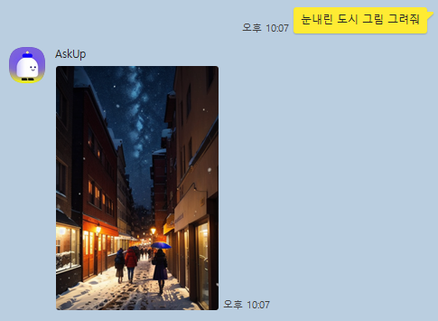 아숙업에서는 이미지를 생성할 수 있습니다. 명령어를 자세하게 입력할 수록 원하는 이미지를 얻을 가능성이 높으며 예시로 ‘눈내린 도시 그림 그려줘’ 라고 입력해보겠습니다.