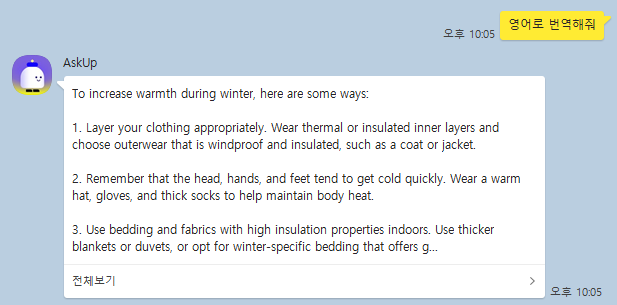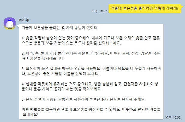 예시로 ‘겨울에 보온성을 올리려면 어떻게 해야해?’ 라는 질문에 아숙업의 답변입니다.
