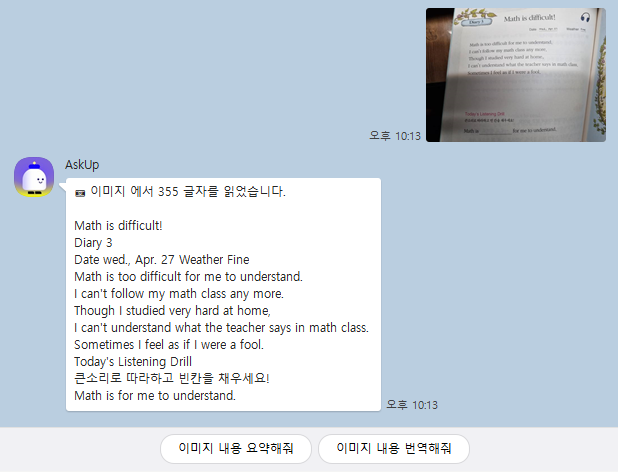 아숙업은 ChatGPT를 카카오톡에서도 사용할 수 있도록 하는 채널로 글씨 뿐만 아니라 이미지도 인식해서 서비스를 제공해줍니다. 챗GPT의 경우 한글로 입력하면 답변 속도도 느린편이라서 불편했습니다. 우리가 많이 사용하는 카카오톡에서 간편하게 기능을 이용할 수 있어 괜찮은 것 같아요