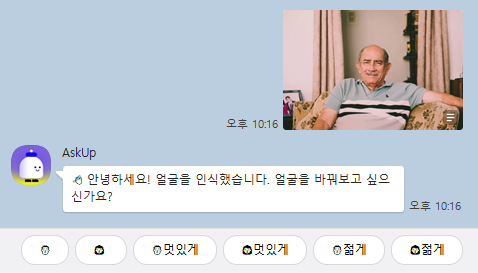 이미지를 인식하는 것 뿐만 아니라 이렇게 셀카를 올린다면 사람얼굴을 인식하여 ‘남자 멋있게’, ‘여자 멋있게’ ‘남자 젋게’, ‘여자 젊게’라는 버튼을 누르면 해당 명령어에 맞춰 얼굴이 바뀌게 됩니다. 서양인 얼굴을 넣었는데 동양인 얼굴이 나온 것은 아직 개선해야할 점이네요