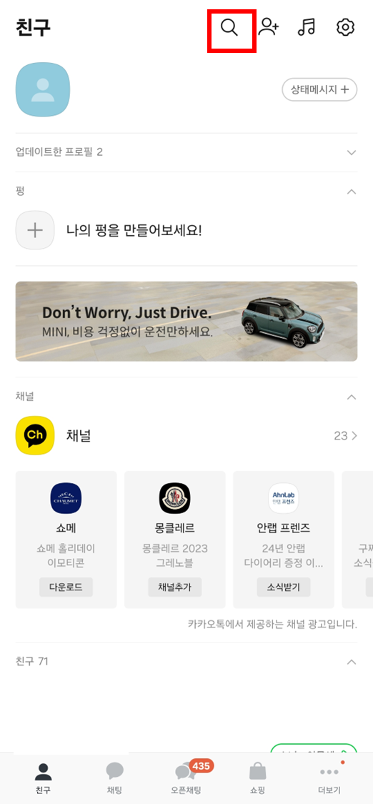 위에서 알려드린 버튼을 눌러 나오는 링크에서 바로 추가해도 되지만 카카오톡에 직접 들어가서 채널을 추가해도 됩니다.