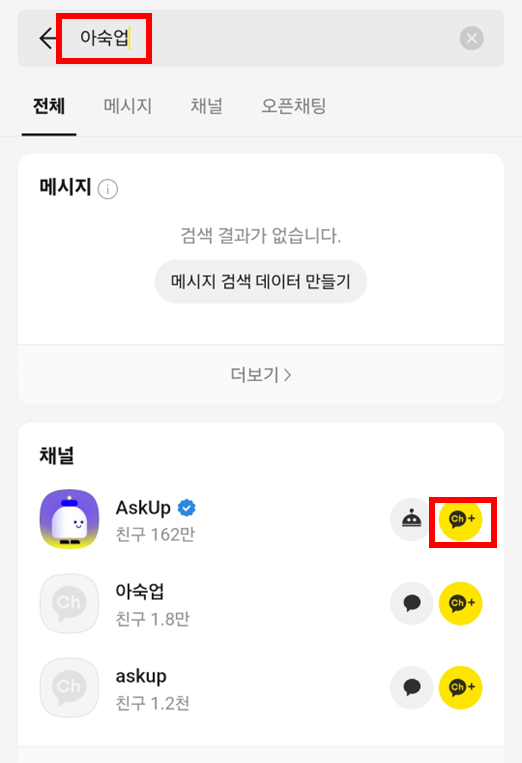 2. 입력창에 아숙업을 입력하고 아숙업 채널을 추가해주세요.